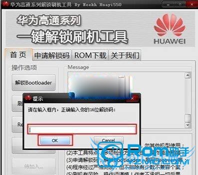 4.把上面的解锁工具下载好,再解压,运行工具后,点“解锁Bootloader”,然后输入申请到的16位解锁码,点击“OK”按钮开始解锁,等待手机重启好之后解锁便成功了!如下图: