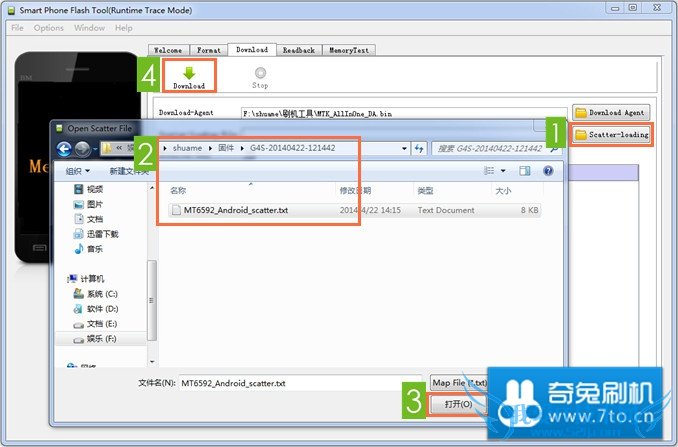 选择 固件 -> G4S-20140422-121442 -> MT6592_Android_scatter.txt ,并打开,如下图: