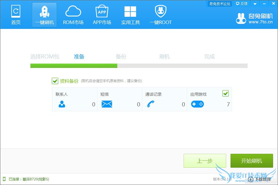 2.点击【一键刷机】,可以选择你要刷的酷派8720 (炫影S) ROM包,如果你还没有下载手机相关刷机ROM包,可以在奇兔刷机ROM市场下载。选择好手机的刷机ROM包之后,进入资料备份界面,刷机会清除联系人, 短信, 通话记录和应用程序,建议大家备份,刷机后可以还原。