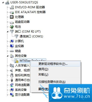 此时设备管理器会出现一个带问号(或者感叹号)的设备,对其右击“更新驱动程序”