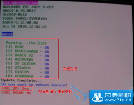 出现如上图所示表示谷歌G5(Nexus One)系统更新刷入成功,手动按音量上键进入系统即可,谷歌G5(Nexus One)救砖成功!