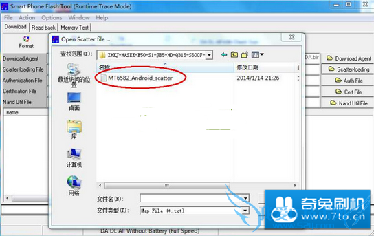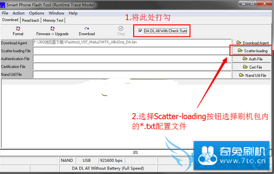 2.将DA DL All With Check Sum处打勾,再选择Scatter-loading按钮,选择刷机包内的***_Android_scatter.txt文件,如图: