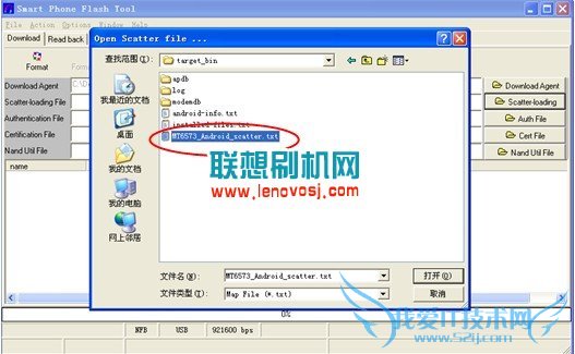 5,选择刚才解压的线刷包,然后选择里面的MT6573_Android_acatter.txt文件确定,如下图: