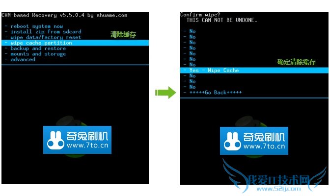 - wipe cache partition 清除缓存 - Yes - Wipe Cache 确定清除缓存