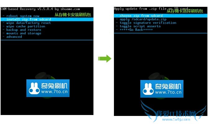 - install zip from sdcard 从存储卡安装刷机包 - choose zip from sdcard 从存储卡选择刷机包