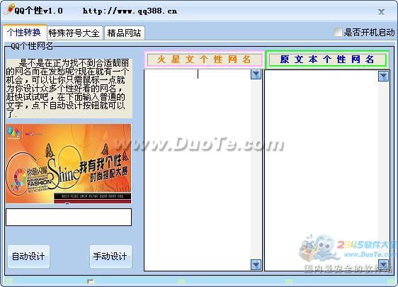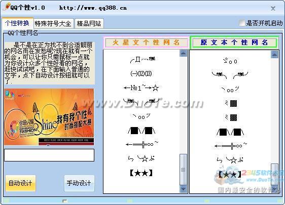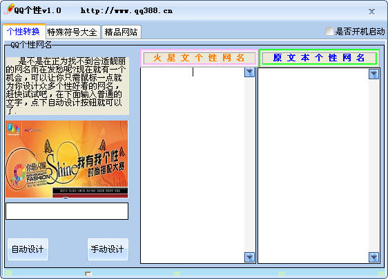 网名qq388软件是qq388个性网名制作的能够自动和手动设计QQ网名的软件,尤其是手动设计,你可以随意发挥你的想象力,能够制作出不一样的QQ网名,软件中有相当多的特殊符号,你可以随意使用。自动生成功能也有不少趣味,比如说,巧妙的融入火星文在其中,这样就可以使用火星文和简体来进行设计,使得效果更加完美,另外软件内置百数个好看时尚潮流的QQ网名,你也可以在不用设计的情况下就直接使用这些网名中的其中一款,网名qq388软件下载无须安装,直接就可以使用。