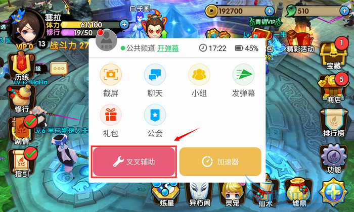 3、在叉叉启动游戏后点击右边的悬浮窗,并点击叉叉辅助。