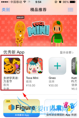 1)打开苹果iPhone5C App Store软件后,找到或搜索要下载的软件,然后点击打开。(如下图所示)