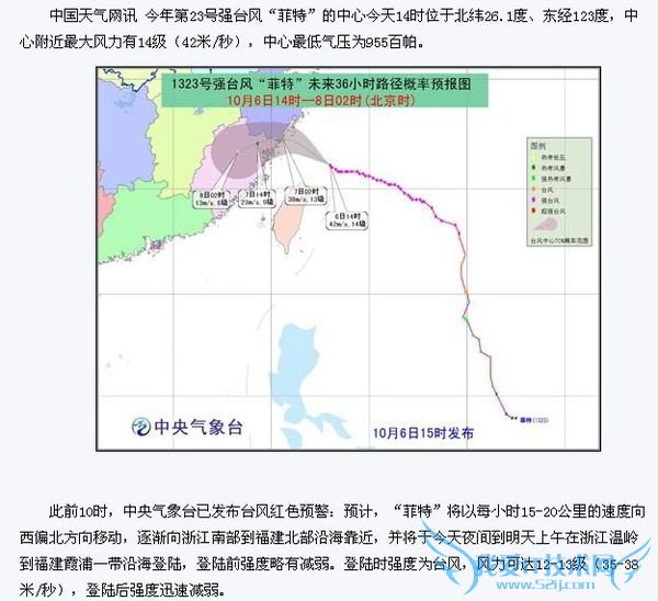 今年第23号强台风“菲特”的中心今天上午10点钟位于浙江温州东偏南方大约365公里的东海南部海面上,就是北纬25.8度、东经123.5度,中心附近最大风力有14级(42米/秒),中心最低气压为955百帕,7级风圈半径350公里,10级风圈半径100公里.