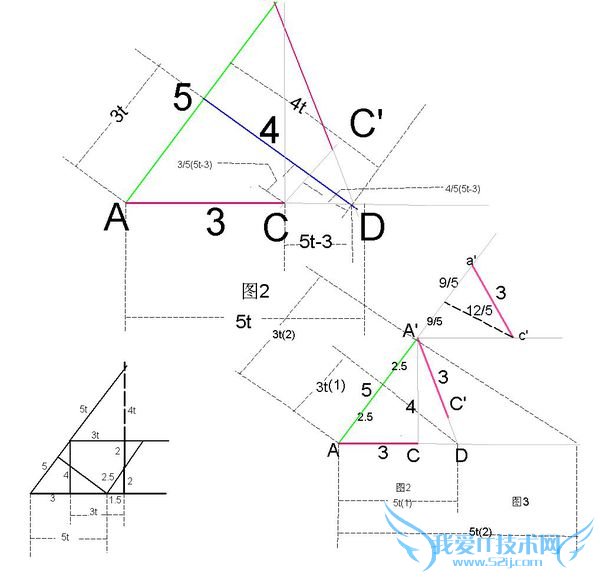 当有公共点时,射线的起点应是首个交点,当A‘C’位移到a'c'位置时,c'点与射线相交,(此时a'c'=3)应该是最后一个交点,各边的数量关系如图,t的取值:t(1)≤t≤t(2),从图上可以看出,3t(1)=2.5;3t(2)=2.5+9/5,因此t的取值范围为:[5/6,43/30]