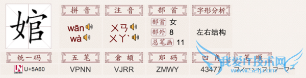 (3) 郑码:ZMWY,U:5A60,GBK:8AFE