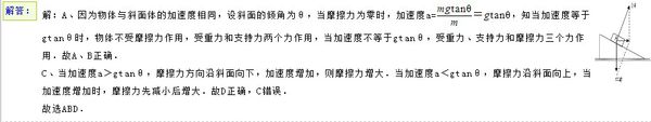 分析:物体与斜面体一起向右做匀加速直线运动,可能不受摩擦力,可能受摩擦力大小,结合牛顿第二定律求出临界的加速度,通过加速度的大小判断出摩擦力的方向,从而确定摩擦力大小的变化.