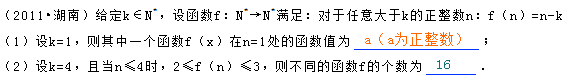 问题4:2011年湖南文科数学第16题怎么解答?16. 给定 ,设函数 满足:对于任意大于k的正整数n: f(n)=n-k(2) 设k=4,且当n≤4时,2≤f(n)≤3,则不同的函数f的个数为________.[数学科目]