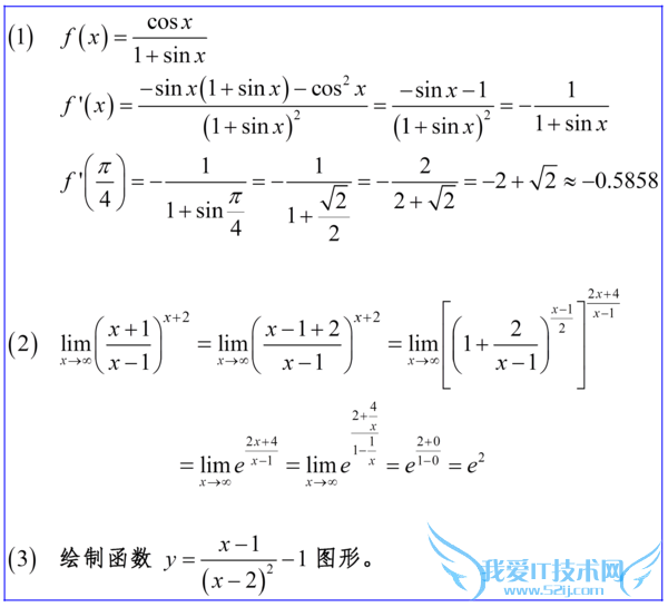 问题5:几道高数题目:1、设函数f(x)=cosx/(1+sinx),求f’(π/4) 2、求极限Limx→∞[ (X+1)/(X-1)] ^x+21、设函数f(x)=cosx/(1+sinx),求f’(π/4) 2、求极限Limx→∞[ (X+1)/(X-1)] ^x+23、做函数的图形 y=[(x-1)/(x-2)[数学科目]