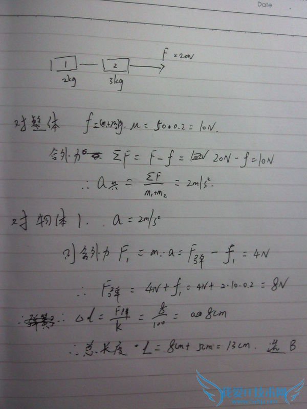 问题5:在水平面上放着两个质量分别为2kg和3kg的小铁块1和2,它们之间用一根自由长度为5cm,劲度系数为100N/m的轻弹簧相连,铁块与水平面间的动摩擦因数均为0.2.铁块2受到一大小为20N的恒定水平外力F,[物理科目]