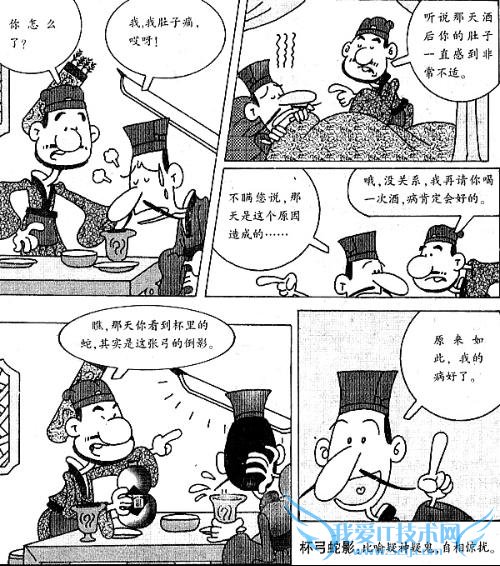 从前有个做官的人叫乐广.他有位好朋友,一有空就要到他家里来聊天儿.有一段时间,他的朋友一直没有露面.乐广十分惦念,就登门拜望.只见朋友半坐半躺地倚在床上,脸色蜡黄.乐广这才知道朋友生了重病,就问他的病是怎么得的.朋友支支吾吾不肯说.经过再三追问,朋友才说:“那天在您家喝酒,看见酒怀里有一条青皮红花的小蛇在游动.当时恶心极了,想不喝吧,您又再三劝饮,出于礼貌,就闭着眼睛喝了下去.从此以后,就老觉得肚子里有条小蛇在乱窜,总想呕吐,什么东西也吃不下去.到现在病了快半个月了.”乐广心想,酒杯里怎么会有小蛇呢?但他的朋友又分明看见了,这是怎么回事儿呢?回到家中,他在客厅里踱来踱去,分析原因.他看见墙上桂着一张青漆红纹的雕弓,心里一动:是不是这张雕弓在捣鬼?于是,他斟了一杯酒,放在桌子上,移动了几个位置,终于看见那张雕弓的影子清晰地投映在酒怀中,随着酒液的晃动,真象一条青皮红花的小蛇在游动.乐广马上用轿子把朋友接到家中.请他仍旧坐在上次的位置上,仍旧用上次的酒怀为他斟了满满一杯酒,问道:“您再看看酒怀中有什么东西?”那个朋友低头一看,立刻惊叫起来:“蛇!蛇!又是一条青皮红花的小蛇!” 乐广哈哈大笑,指着壁上的雕弓说:“您抬头看看,那是什么?”朋友看看雕弓,再看看杯中的蛇影,恍然大悟,顿时觉得浑身轻松,心病也全消了.