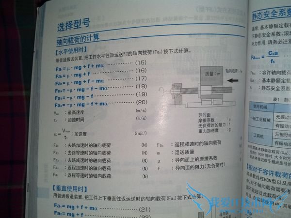 在丝杠与导轨组合的传动系统中,丝杠不是受力部件,导轨才是,所以移动台的质量是传递到导轨部分的.所以轴向载荷的计算如下: