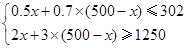 (1)根据题意可得:生产A型桌椅套数×0.5+生产B型桌椅套数×0.7≤302,生产A型桌椅套数×2+生产B型桌椅套数×3≥1250,设生产A型桌椅