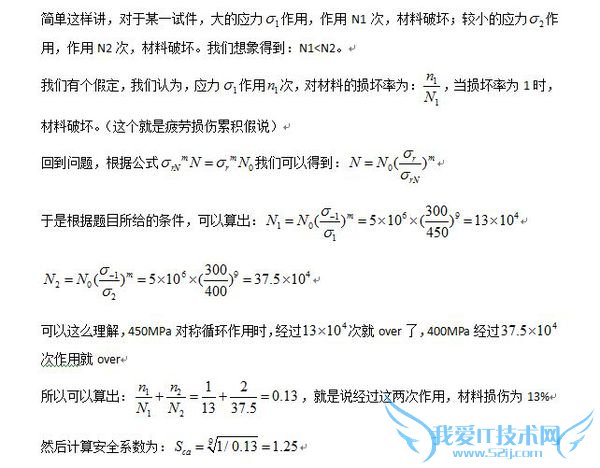 问题5:45钢经调制后的疲劳极限σ-1=300MPa,应力循环基数N0=5×106次,疲劳曲线方程的幂指数m=9,若用此材料做成的试件进行试验,以对称循环应力σ1=450MPa作用104次,σ2=400MPa作用2×104次.则工作安全系数为多