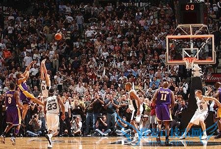 你说的应该是03-04赛季,西部决赛湖人对马刺,在还有0.4秒的时候,费舍尔完成的绝杀.为什么称为绝杀中的绝杀?是因为0.4秒太短暂了!知道0.4秒有多久么?你眨一下眼睛耗费的时间是0.4秒.当时费舍尔能够完成绝杀实乃天来之笔.在邓肯投完之后只给了湖人0.4秒,湖人队不放弃最后的0.4秒.连续叫了三次暂停后,佩顿将球传给费舍尔.后者接球后根本没有思考的机会,转身就投,球应声而中.所以说称之为绝杀中的绝杀.