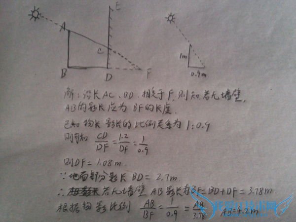 问题1:如图,一物体AB的影子不全落在地面上,有一部分影子刚好落在墙CD上,影子高为1.2m,又测得地面部分的影子为2.7m,而此时1m的竹竿影子长为0.9m,则此物体AB的高为?m