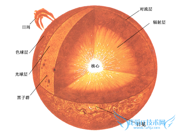 太阳的内部主要可以分为三层:核心区、辐射区和对流区.太阳中心区的物质密度非常高.每立方厘米可达160克.太阳中心区之外就是辐射层,辐射层的范围是从热核中心区顶部的0.25个太阳半径向外到0.86个太阳半径太阳内部能量向外传播除辐射,还有对流过程.即从太阳0.86个太阳半径向外到达太阳大气层的底部,这一区间叫对流层.这一层气体性质变化很大,很不稳定,形成明显的上下对流运动.这是太阳内部结构的最外层.