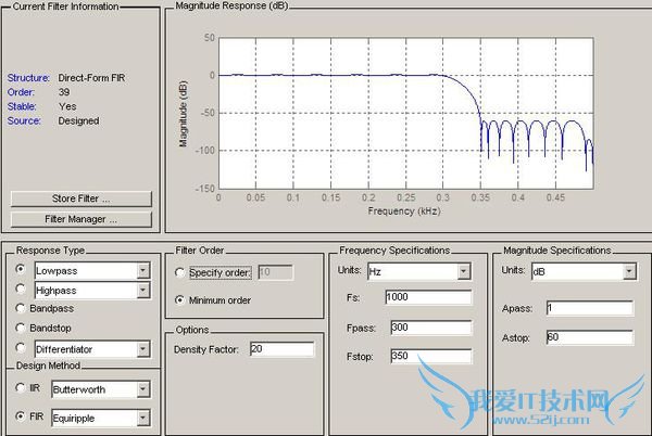 设定滤波器类型为你说的低通滤波器,FIR类型,设定f pass=300Hz,f stop=350Hz.阻带衰减60dB