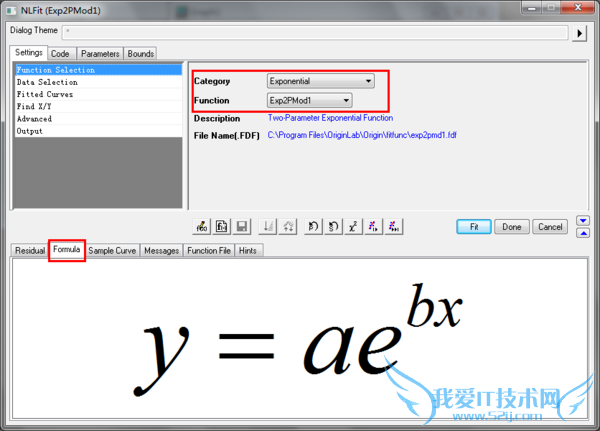 其次,你的方程实际上可以用 y = a×exp(bx) 表示,a=15.56,拟合b就行了。Origin程序里自带这个函数,点击Origin菜单栏上的 Analysis —> Fitting —> Nonlinear Curve Fit —> Open Dialog 后,弹出如下图的菜单,选择 Category:Exponantial ; Function:Exp2PMod1,如下图中红框所示: