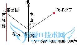 即:在平面图上花城小学在花城广场北偏东60°方向4厘米,由此画图如下;