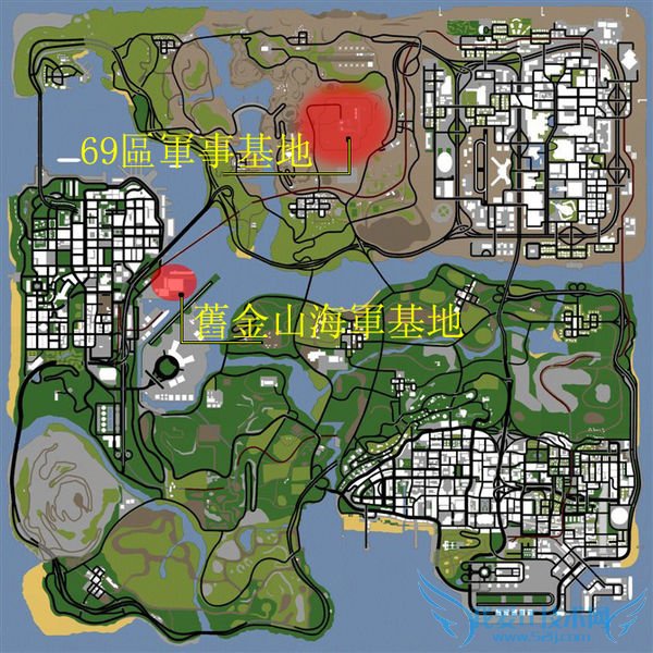 如图,红色区域就是军事基地,一个69区和一个海军基地。海军基地有企业号艘航母,但是不可驾驶。所有剧情过关后69区有坦克和鹞式飞机,但无论从陆地还是空中进入都会有警星。海军是5星通缉,69区貌似4星。想进去看的话可以输入秘笈无罪模式:AEZAKMI。