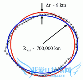右图:在这张示意图中,为观看方便起见,太阳的椭率被放大了10000倍.蓝色曲线表示在3个月中太阳的平均外观.黑色星号表示在较短的10天内的平均值.10天平均值曲线的波动是真实存在的,这是太阳黑子附近的强磁脊导致的.大图请点击