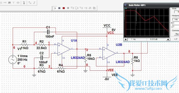 如图,是± 5V的,Au=2(对于同相输入端的Au不会小于1),直流增益为6.015dB,在100Hz处降为3.004dB,转折频率为100Hz,完全符合题意(但是它的信噪比较低,因为使用的是大电阻,热噪声可能较大)。如果使用了单电源供电,需要从电源上引入偏置电压到输入端以保证信号的完整性,而且输出的电压将比电源电压小很多(Vo
