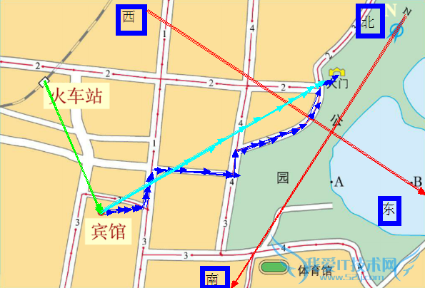 (3)、从宾馆到公园最佳路线及图中所示深蓝色路线.
