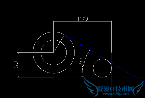 先随便画一条水平线(画长一点),顺时针旋转31度,以直径圆100和直径圆61的圆心为起点垂直于刚才画的那条旋转后的线,这样会出现一个与圆的交点,再把旋转后的线移至交点处,这样斜线就画出来了.再以直径圆100和直径圆61的圆心画一条竖线,向右偏移139.两条线画好了,加上50度角的那条水平线,再用命令(相切,相切,相切)画圆,那条圆弧就出来了.
