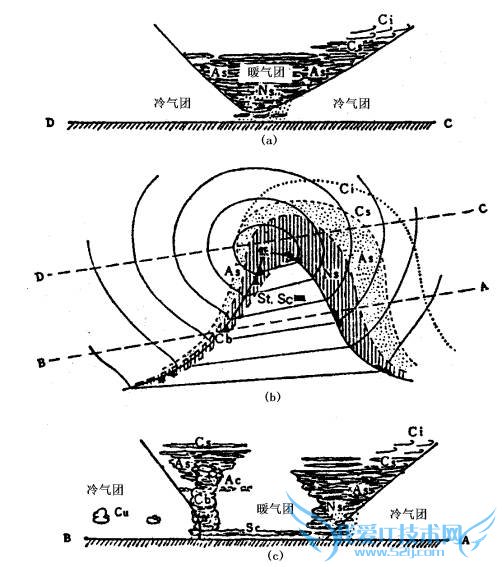 气旋是低压中心控制的,多于锋面组成锋面气旋,气旋前方多出现连续性降水,气旋后方出现冷锋和降水.中部降水少.