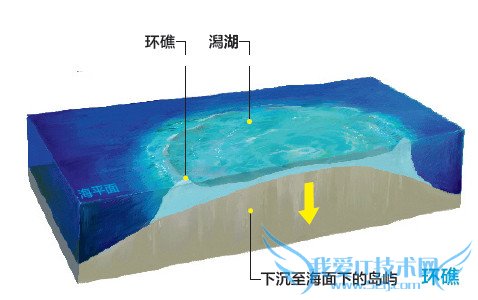 3.若岛屿完全沉降至水下,海面上只剩下一圈带状的珊瑚礁,这时标准的“环礁”也就形成了。