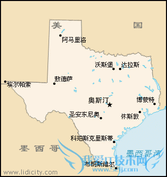 德克萨斯州名称来自印地安Caddo族语,其意义是朋友(Friends).最早来到此地的欧洲人是1519年西班牙的探险家阿隆索(Alonso Alvarez de Pena),到了1541年时,阿瓦(Alvar Nunez Cabeza de Vaca)和弗朗西斯科(Francisco Vasquez de Coronado)探险德州内陆地区,1682年西班牙开始殖民,1685年法国人也来了.1803年路易斯安那购买案(The Louisiana Purchase)让美国买下了法国在这个地区的土地所有权.1821年墨西哥独立,并从西班牙手里接管此区;1836年3月6日,与墨西哥的第一场独立战争在阿拉摩(Alamo)持续两周,最后寡不敌众,约190人全员阵亡.4月21日德州人在现今的休斯顿附近取得决定性的胜利,得克萨斯共和国终于诞生.1845年12月29日加入美国,成为第二十八州,南北战争期间曾加入邦联. 州府奥斯汀(Austin),位于本州岛东南部,人口30万.大都市达拉斯(Dallas)在本州岛东北部,人口超过100万(大都会区180万),为美国石油之都.休斯顿(Houston)在本州岛东南部,人口200万,为本州岛第一大都市,也是美国太空研究中心.圣安东尼奥(San Antonio)位在中南部,人口不到50万,市内错综的运河系统和观光舢舨船成为本市一大特色,加上阿拉摩(Alamo)位于此地,吸引许多观光客前来.州内高等学府有130多所,其中最著名的是设于州府之内的得克萨斯大学,创于一八八三年,学生人数约六万七千. 本州岛特征有六:第一,面积在五十州列第二,仅次于阿拉斯加州,是美国大陆最大之州.第二,农业方面,乃是美国棉产量最富之州.第三,畜牧方面,它是美国牛产量最多之州.第四,矿产方面,它是美国石油产量最大之州,约占美国石油总产量三分之一.第五,石油化学工业方面,大公司全美国约有廿家,其中有十九家位于本州岛之内.第六,历史背景很复杂.除了美国领土之外,先后曾属于五个国家(西班牙、法国、墨西哥、得克萨斯共和国、美国邦联),现在在圣安东尼奥的阿拉摩还可以看到六面旗子同时飘扬. 本州岛地势大部分平坦,由西北向东南倾斜.许多河流由西北向东南流,注入墨西哥湾内,全境可分为三区:(A)西北部是高原区之一部.(B)西南部是山地区,落矶山地这一部.(C)中部及东部全是平原区,为墨西哥湾岸平原之一部.除沿海部分外,产棉极富.高原区与平原区牧场极多,牛只约一千三百万头;羊只之多,在五十州内也列第一位.此外,本州岛出产之石油与天然气亦为各州之冠.