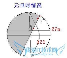 1.元旦两地同时日出,说明同时位于晨线上,如图所示,很显然12月22日晨线和经线夹角更大,当甲地日出的时候,乙地还在黑夜——说明12月22到元旦之间甲地比乙地先看到日出.两者之间时间相差8天左右,当然12月前同样也有8天时间,所以总共大约半个月时间. B.半个月