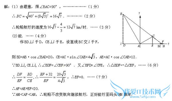 问题3:2010无锡中考数学23题正确答案23、在东西方向的海岸线l上有一长为1km的码头MN(如图),在码头西端M的正西19.5km处有一观察站A.某时刻测得一艘匀速直线航行的轮船位于A的北偏西30°,且与A相[数学科目]