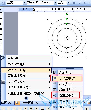 不知道你word什么版本的,我按照2003版给你说一下.2007,2010包括2013的方法和这个一样,只是对齐按钮的位置不同,方法原理是一样的.按三个圆+圆心来描述,三个圆会的 话两个圆更简单.