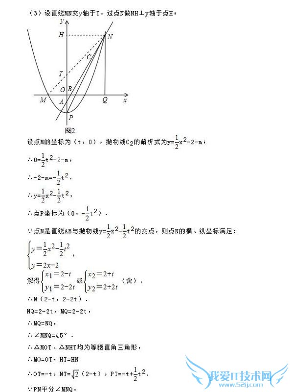 (3)根据二次函数的平移规律,先求出抛物线C2的解析式和顶点P的坐标,联立直线AB的解析式可得到点N的坐标.结合N、Q、M三点坐标,易发现△MNQ是等腰直角三角形,过N作NH⊥y轴于H,设MN交y轴于T,那么△MOT、△NHT也是等腰直角三角形,由此求出OT、HT、PT的长;NP是∠MNQ的角平分线,且NQ∥y轴,能证得△NTP是等腰三角形,即NT=TP,由此求出P点的坐标,结合抛物线C2的解析式,即可确定m的值.