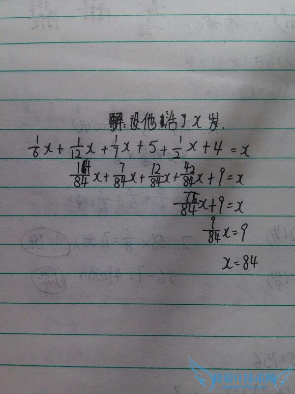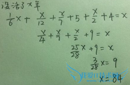 他先活了生命的六分之一,又活了十二分之一,再活了七分之一,然后身下孩子后,孩子只活了丢番图生命的二分之一,减去这些分数,只剩下结婚的那5年和悲痛的那四年,解一下方程,所以是84岁