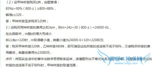 问题2:我市某林场计划购买甲、乙两种树苗共800株,甲种树苗每株24元,乙种树苗每株30元.相关资料表明:甲、乙两种树苗的成活率分别为85%,90%,设购买甲种树苗x株,购买树苗的总费用为y元我市某林[数学科目]