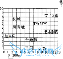(4)木板教堂位于(8,7),向北偏东约500米,到达荷兰风车;艺术剧场位于 (11,5),在荷兰风车南800米处.