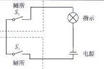 只有当两个厕所的门都关上时,车厢指示灯才会发光,说明两个门(开关)同时控制电路,只有都关闭才会形成闭合的回路.因此两门(开关)应串联.