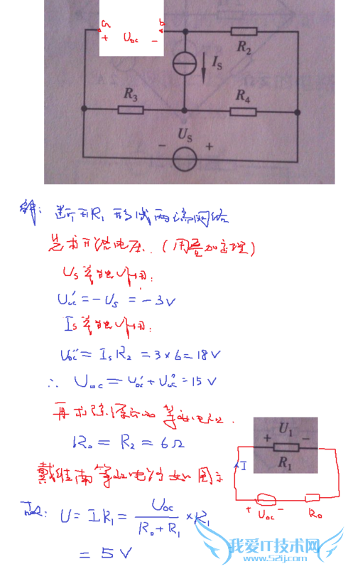 问题5:已知R1=3Ω,R2=6Ω,R3=1Ω,R4=2Ω,电压源电压Us=3V,电流源电流Is=3A,用戴维南定理求电阻R1两端电压U1[物理科目]