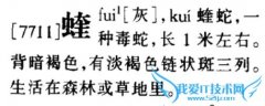 蝰拼音:kuí部首:虫,部外笔画:9,总笔画:15五笔86&98:JDFF仓颉:LIKGG笔顺编号:251214134121121四角号码:54114UniCode:CJK统一汉字U+8770◎蛇〕一种毒蛇,生活在森林里...