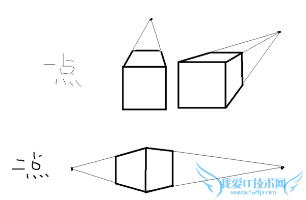 透视分为很多种 像清明上河图的散点透视就是很复杂的一种 简单的有2点透视和1点透视 如图 另外刚开始学习建议用2h 2b 但关键还是手上的力度和对事物的感知度而不是靠铅笔的型号来作业