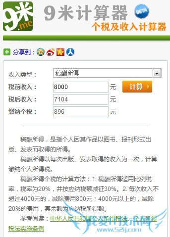 8000元稿费的个税由9米计算器计算为896元,税后为7104元.http://9mi.me