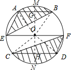 如图,作直径MN,使MN⊥EF于O,交AB于G,交CD于H;连接OA、OB、OC、OD;